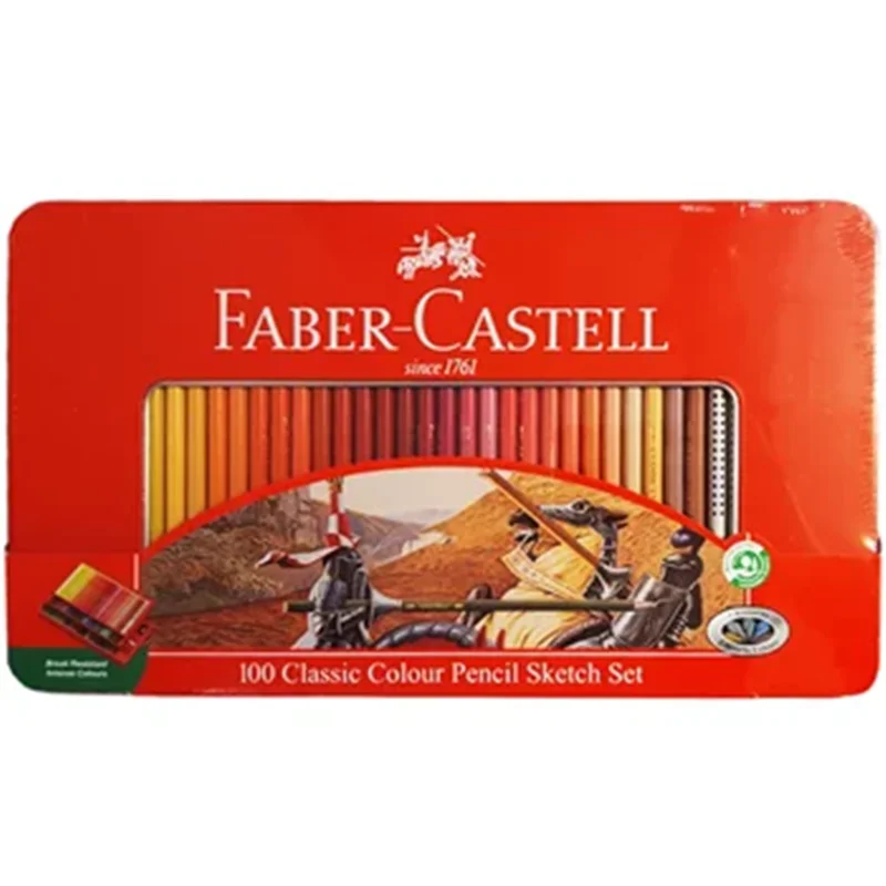 مداد رنگی فابرکاستل Faber Castell جعبه فلزی تخت کلاسیک 100 رنگ درخشان از جمله طیف متالیک، مداد رنگی کلاسیک با رنگدانه های با کیفیت بالا برای پوشش و ترکیب رنگی عالی ساخته شده است. مداد رنگی فابر کاستل 100 رنگ با شکل شش ضلعی با سرهای صاف و ضخیم 3.3 میلی متری که در برابر شکستگی مقاومت می کند. مداد رنگی دائمی در سایز استاندارد، آنها دارای رنگ های زنده و فرآیند چسبندگی خاصی هستند تا در برابر شکستگی مقاوم و بادوام شوند. که جعبه مداد رنگی شامل 100 مداد رنگی شش ضلعی، 2 مداد گرافیتی گریپ، 1 تراش، 1 پاک کن که از چوب های